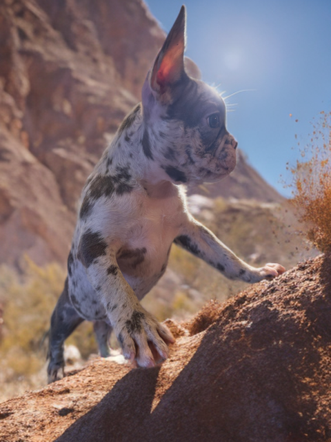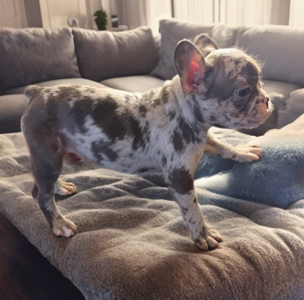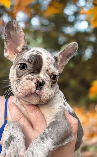 Split was born on July 14th and is eagerly waiting to find his forever home! He’s a stunning blue and tan merle with the sweetest, most lovable face. Playful and affectionate, he loves to cuddle up with his humans. His build is perfect, and his unique markings make him truly special!