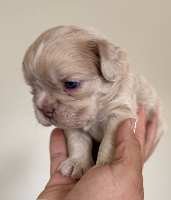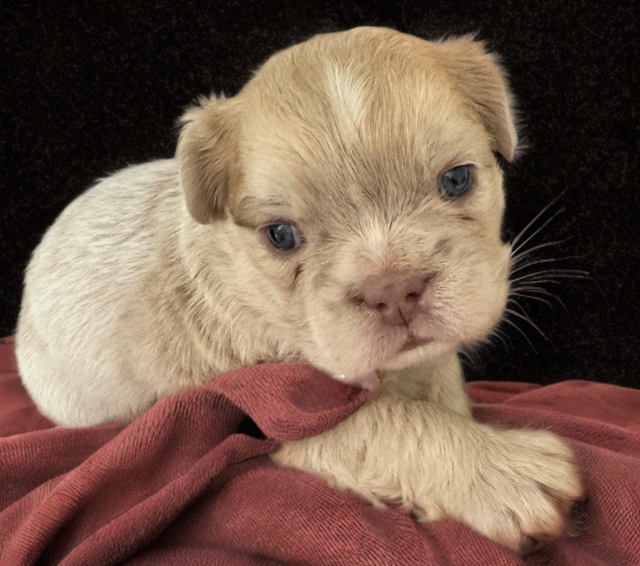 This beautiful girl was born on October 17, 2025. Artemis is an Isabella Fawn Merle with a full, fluffy coat. She also carries tan points, cocoa, and cream, making her a producer of the color new shade. Her DNA profile is Ay/At b/b Co/co d/d Em/e M/n L1/L1.