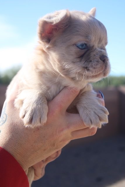 This adorable boy was born on 10/17/2025. Though he started as the runt of the litter, Apollo has grown to become one of the biggest! He is a New Shade & Tan Merle, carrying both cream and solid genes. His DNA profile: At/a b/b co/co d/d Em/e M/n L1